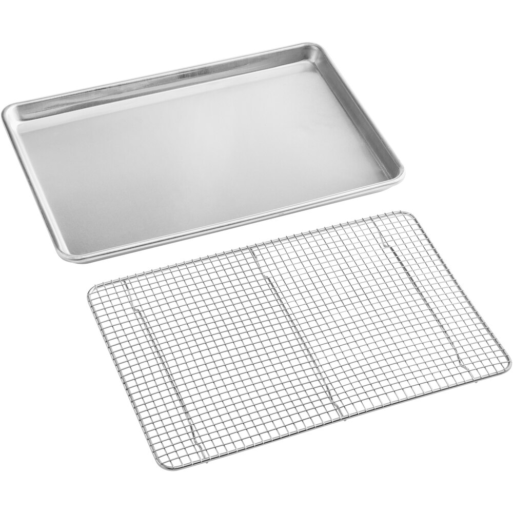 This kit includes a half size wire in rim aluminum sheet pan and a half size fitted cooling rack. The half size pan is great for bakeries, cafeterias, restaurants, and cafes. Both the pan and the cooling rack are built to withstand the daily demands of your busy commercial kitchen. Plus, they are easy to clean, making this kit a time-saving addition to your establishment.