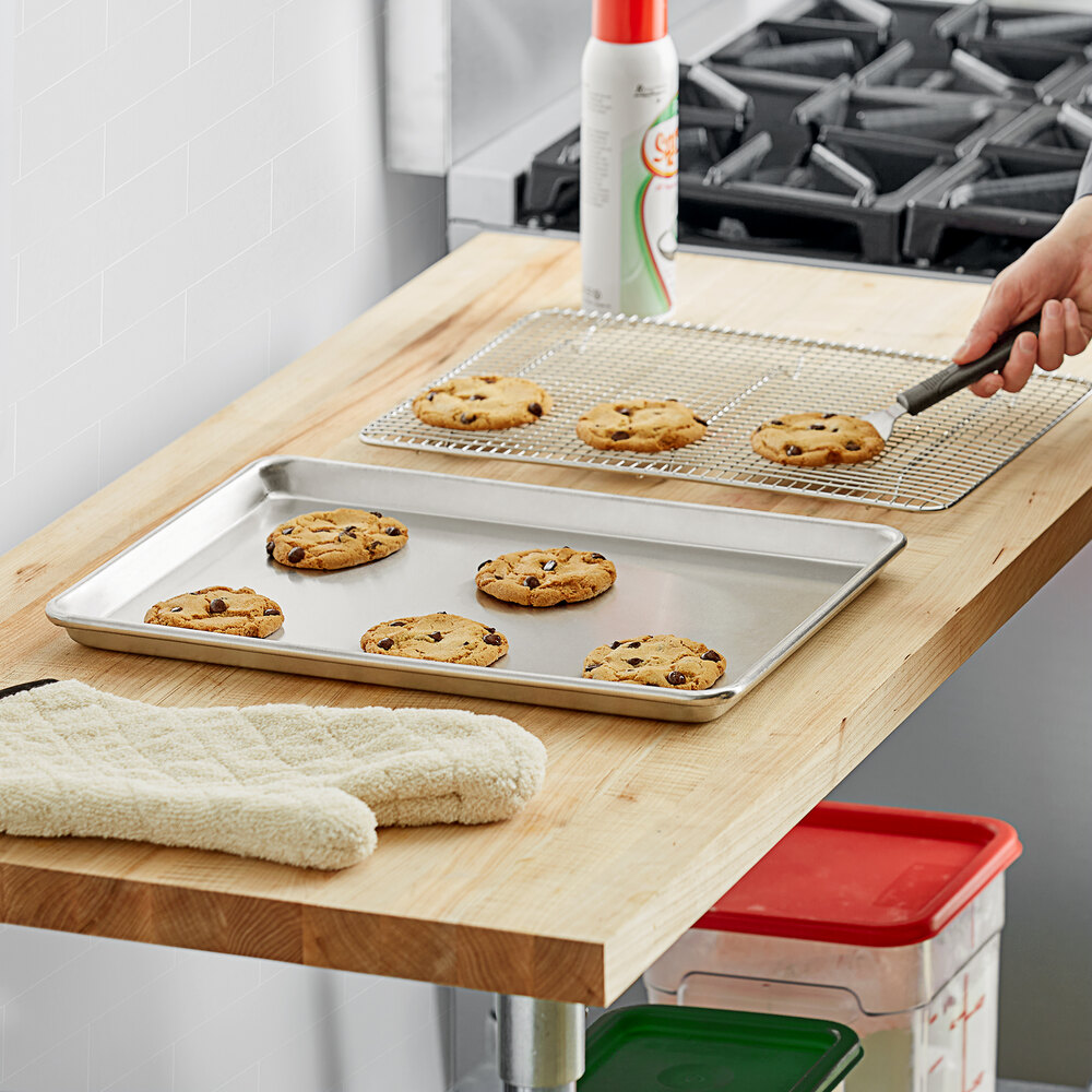 The footed rack can be used for prepping fresh vegetables or making wings, as it allows you to cook product while also keeping it from becoming soggy due to juices. It can also be used simply to make and then cool your famous homestyle baked goods. Ideal for making a variety of sweet or savory foods, purchase this sheet pan and cooling rack set to complete your arsenal of kitchen tools.
