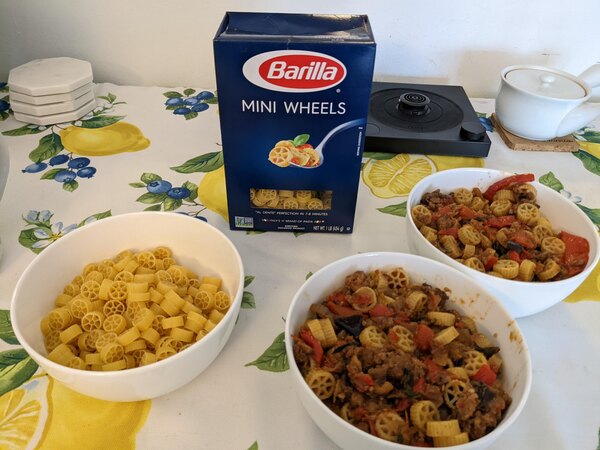 The mini wheels pasta shape cooks quickly compared to other thicker shapes, and it holds a lot of sauce in the holes. We like to eat it with thick tomato based meat sauces. Delicious high quality pasta.