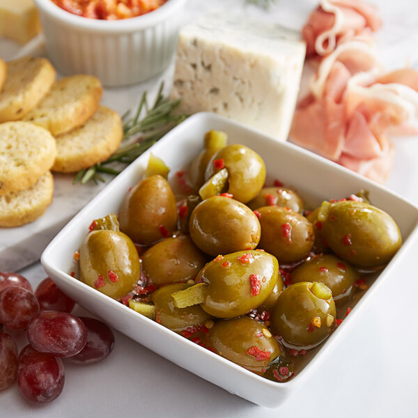 Though they have plenty of applications behind the bar, these olives are also a perfect addition to your food menu! Their delicious flavor and premium appearance make them perfect for displaying on a charcuterie board alongside sliced meats, cheeses, and pickled treats like cocktail onions and cornichons. You can also serve them as a cheeky alternative to the traditional pickle spear that accompanies your signature sandwiches and burgers! No matter how you choose to present them, these large, hand-stuffed queen olives are sure to become a favorite in your kitchen!