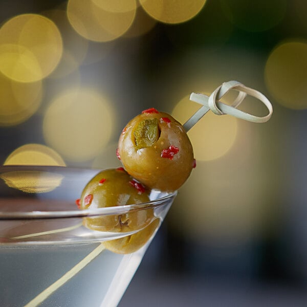 These premium, hand-stuffed queen olives are a perfect addition to your bar's signature spicy dirty martini! They mingle perfectly with the flavors of vodka or gin, vermouth, and olive brine to create a cocktail that is as deliciously piquant as it is beloved. Beyond crafting an exciting dirty martini, these olives are a staple to your brunch's exclusive Bloody Marys, where their sweet heat will complement this classic beverage! Experiment with adding these olives to other savory cocktails for a truly exciting drink menu.
