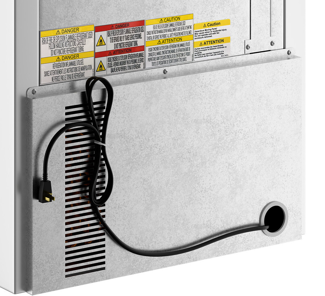 The system boasts a 1/4 hp compressor and uses environmentally-friendly R-290 refrigerant. This unit chills glasses and plates at -10 degrees Fahrenheit. Integrated coils automatically defrost, while a built-in automatic and non-electric condensate evaporator system eliminates the need for any floor drains or additional plumbing.