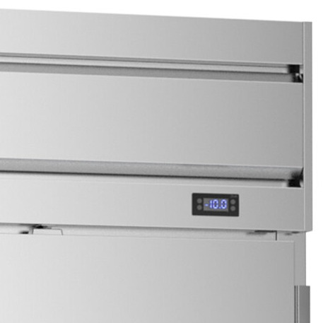 The refrigeration system is top mounted to prevent clogging from the dust and dirt on the floor. The evaporator is even located outside of the food zone for increased storage capacity. For user convenience, this unit features an easy-to-use electronic thermostat and a digital display. A key pad is also included to adjust the temperature while status indicators make for easy monitoring. At the end of the day, the freezer is easy to clean under and around thanks to its 6" casters.