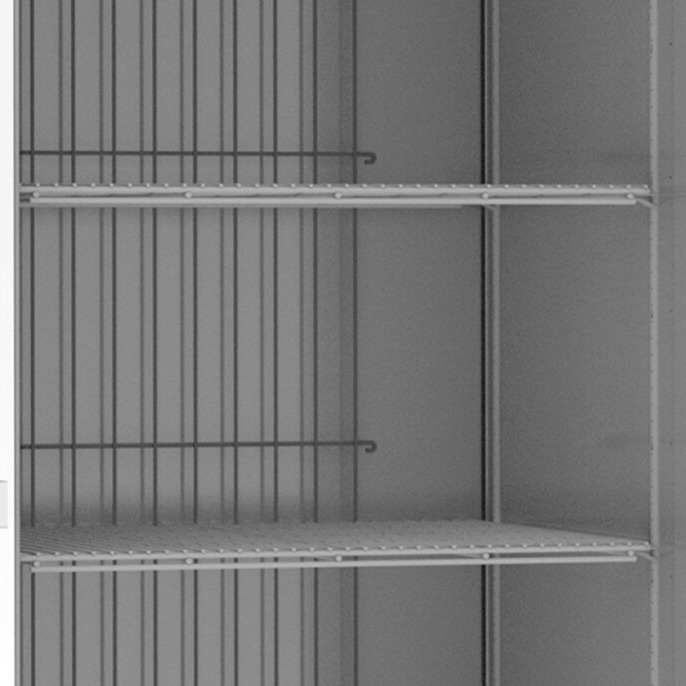 - Solid, self-closing door with a stay-open feature, magnetic gasket, and lock
