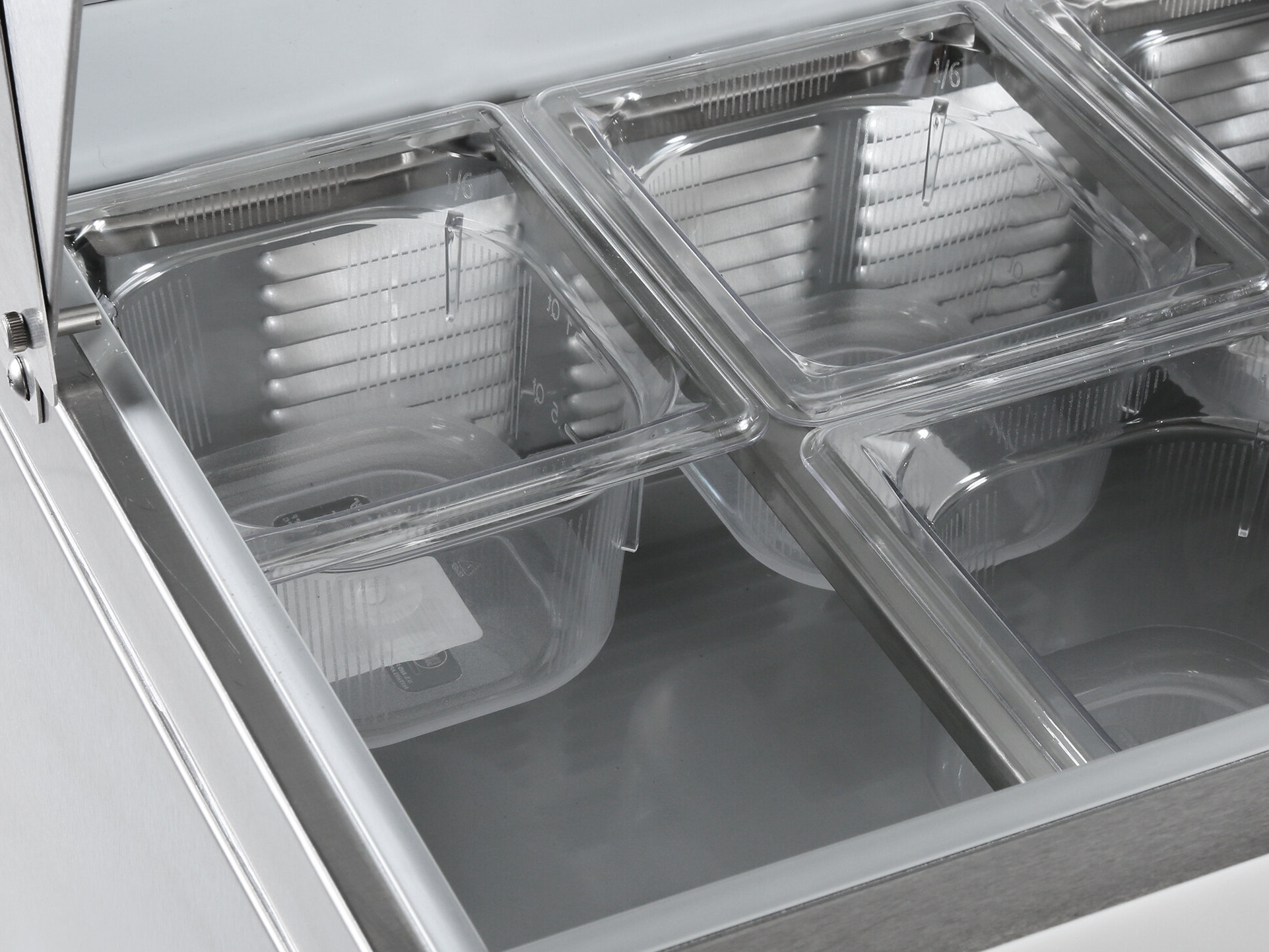 - Top holds (8) 1/6 size food pans (included)