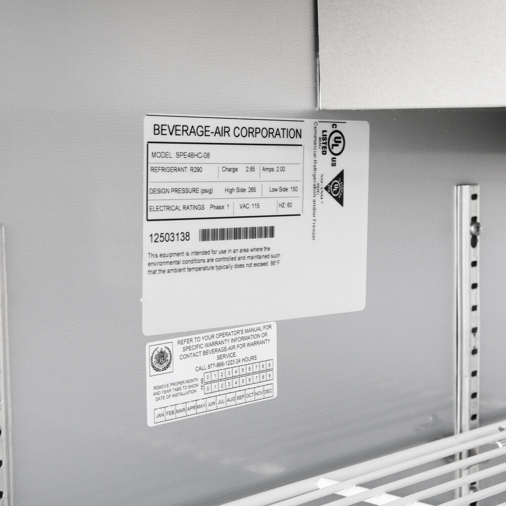 The table's high-capacity refrigeration system with 1/4 hp compressor runs on eco-friendly R290 refrigerant. This specialized refrigerant has an ozone depletion potential (ODP) of 0 and a global warming potential (GWP) of 3, making it an environmentally-responsible choice for your business. To ensure temperature retention and optimal energy efficiency, the cabinet features CFC and HCFC-free foamed-in-place polyurethane insulation.