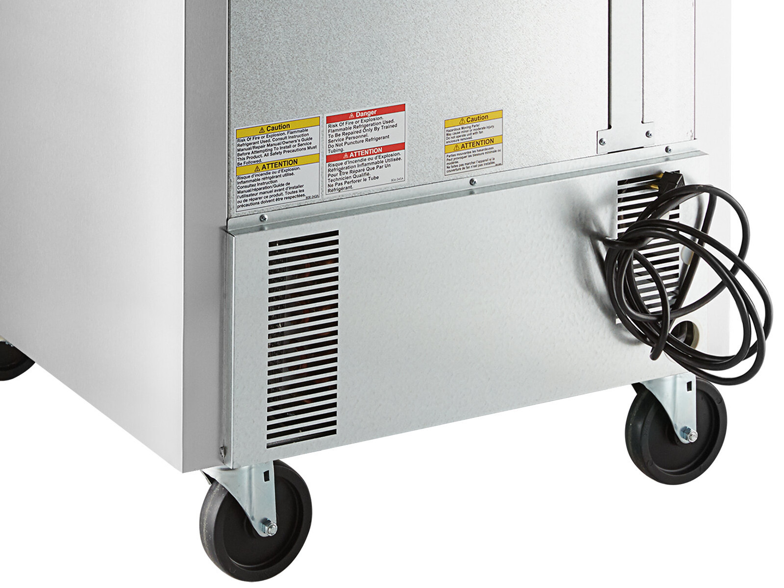 Made of a durable, heavy-duty stainless steel exterior and aluminum interior, this refrigerator is durable for frequent use in your commercial kitchen. It's built with a 1/2" thick sub-top and has a self-closing door with magnetic gasket that reduces temperature loss. Plus, a stay-open feature makes it great for high-volume loading and unloading, and cam-lift hinges eliminate door sagging for long-lasting service.