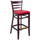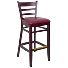 Offer your guests a comfortable and stylish seat with this BFM Seating Berkeley dark mahogany beechwood ladder back barstool with 2" burgundy vinyl seat. This barstool boasts a durable beechwood construction that resists chipping and scratching more than traditional woods. Its warm dark mahogany finish creates a sleek, contemporary appearance while also helping to hide signs of wear better than lighter finishes. Plus, this barstool features a dipped, catalyzed lacquer finish that provides additional durability and accentuates the natural wood grain of the barstool's frame.
