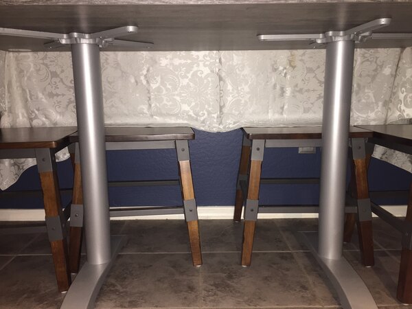We bought these to go with our BFM Seating Midtown Textured Concrete Laminate Indoor Tabletops for parties of 4 and they work great. They make the table a little higher than we would like for playing board games on, and I wish they were a little shorter, but they look great and make for a level and sturdy table. The feet area adjustable with works well for our natural industrial flooring that requires lots of table leveling. I like these a lot better than the center table bases, which we have had many issues with for our 2 tops. No such issues with these for 4 tops. They are great and I highly recommend them. They add considerable weight to the table top, but can still be easily lifted by two people for moving around to accommodate different floor layouts.