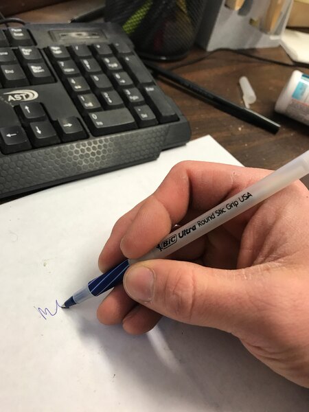 These are a modest upgrade to the classic Bic stick pens. These have most of the same advantages of low cost, durability, and reliability, but also add a bit of rubber to the writing end to make them a bit more comfortable.