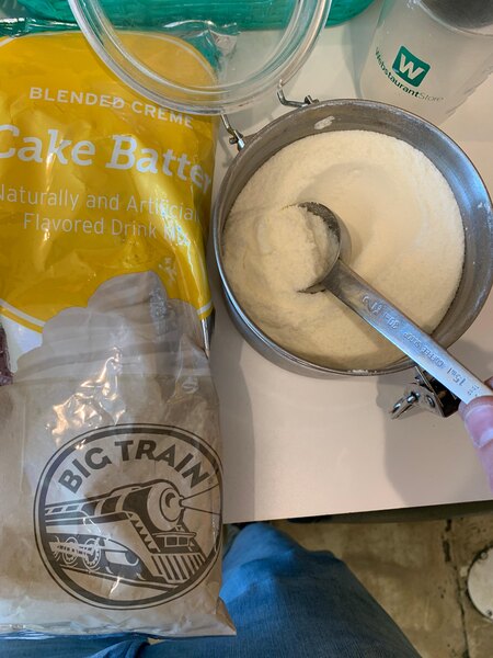 The big train cake batter frappe mix taste so good we use it at our mobile concession business for milkshakes the taste is out of this world will be buying more
