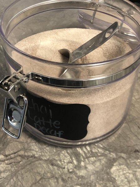 Iced: For an 8 fl. oz. (240 mL) iced drink, combine 2 scoops (6 tablespoons) of chai mix with 5 fl. oz. (150 mL) of hot water. Stir rapidly until dissolved. Pour into a 16 oz. cup filled with ice, then add 2 fl. oz. (60 mL) of cold water or milk. Stir and enjoy!