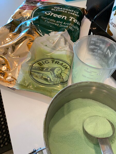 The Big Train Green Tea Mix is excellent. I like to add half an ounce of vanilla syrup in the blended form. There can sometimes be a slightly chalky after texture on the tongue, but for some reason the added syrup eliminates that.