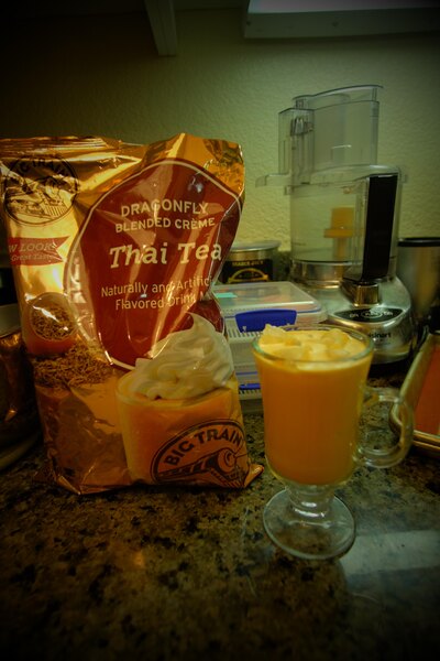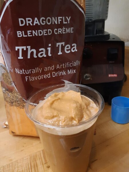 Super quick easy way to make a delicious Thai tea frappe. The flavor is spot on and I don't have to steep tea any more.