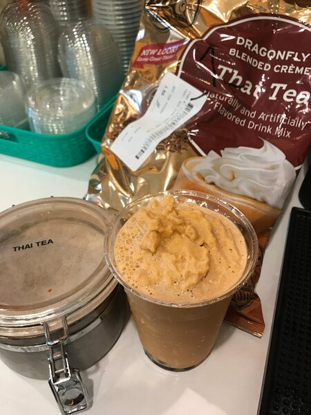 This big train dragonfly Thai tea blended creme frappuccino mix is very poplar ,so easy to mix is really tasty yummy oh my god is good ,I want some right now