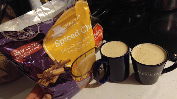 Iced: For an 8 fl. oz. (240 mL) iced drink, combine 2 scoops (6 tbsp.) of chai mix with 5 fl. oz. (150 mL) of hot water. Stir rapidly until dissolved. Pour into a 16 fl. oz. cup filled with ice, then add 2 fl. oz. (60 mL) of cold water or milk. Stir and enjoy!