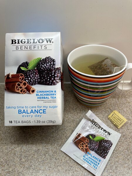 2 bags of Bigelow Benefits cinnamon and blackberry herbal tea