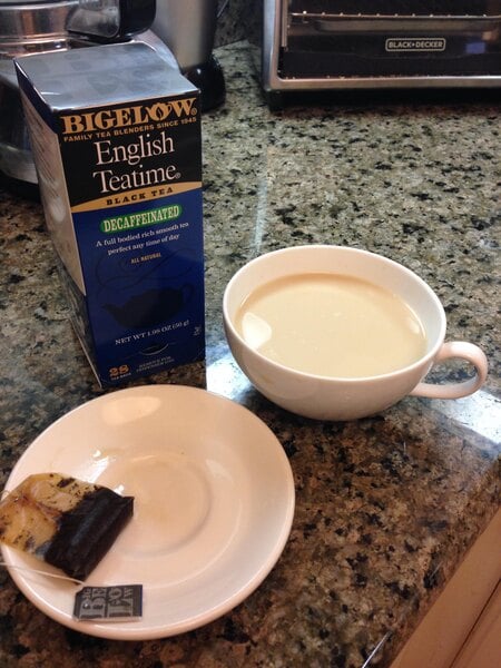 Boil 1 cup of water. Steam milk in the microwave or on the stovetop. Pour boiling water into a cup with the Bigelow English Teatime decaffeinated tea bag and steep tea for 2 minutes. Take the tea bag out and stir in sugar. Froth steamed milk with a handheld frother. Pour the milk on top of the tea and serve!