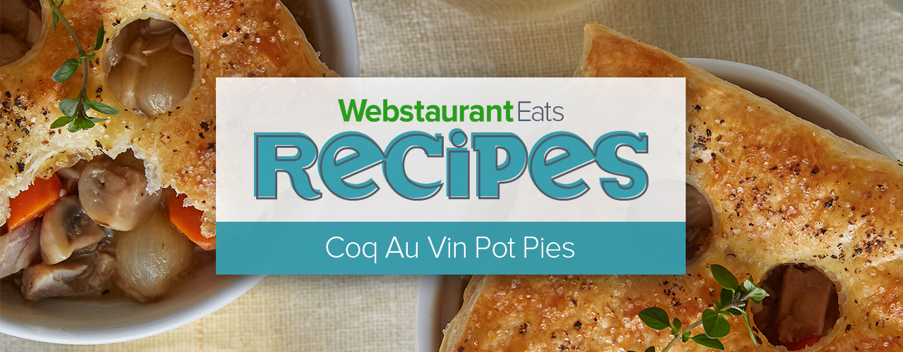 Complete the coq au vin recipe by placing the remaining sprigs of thyme on top of each pot pie and serve to your guests to enjoy. Everyone will fall in love with this simple alternative home style French dish! You can find other recipes like this on the WebstaurantStore blog.