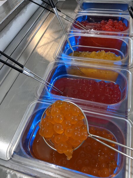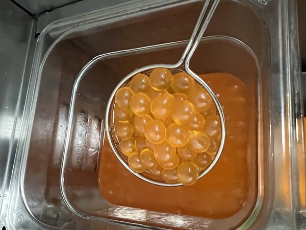 The peach bursting boba is really delicious. It has a strong peach flavor that is noticeable even in strongly brewed tea that is reminiscent of peach rings. My only complaint is that it leaves a very thick membrane behind when it bursts. The other brands I have purchased do not do that, so I wanted to mention it. I also didn't notice in the ingredient list that it contains sucralose.