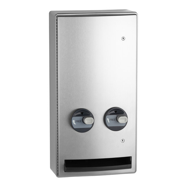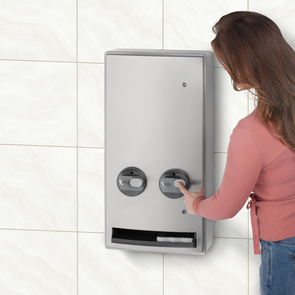 Offering reliable performance, this vendor features a convenient push-button operation that requires less than 5 lb. of force to dispense napkins and tampons. This ensures a tight grip is not necessary and no pinching or twisting of the wrist. It's calibrated for free use upon arrival for effortless operation.