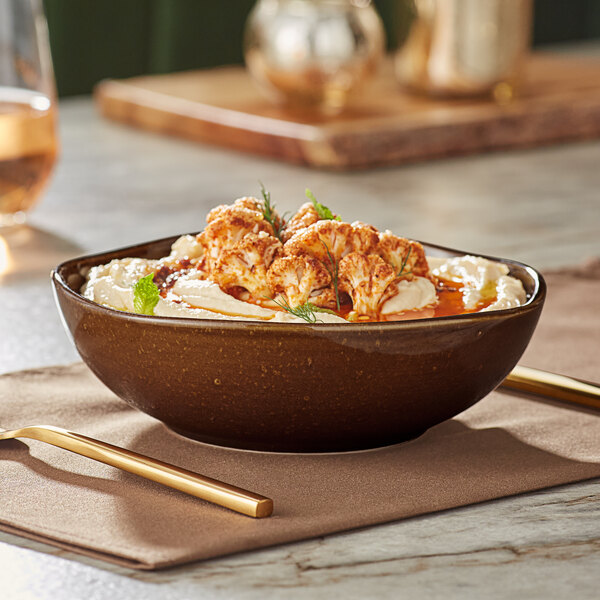 This bowl's rich brown reactive glaze adds a pop of color to your table setting, creating a visually appealing presentation. Mix and match this hazel bowl with other colors from the collection to create a dynamic and eye-catching display, or let it stand alone as a statement piece.