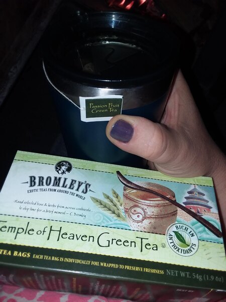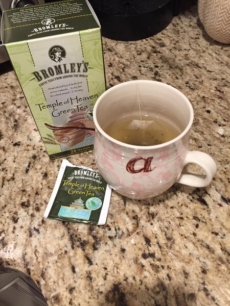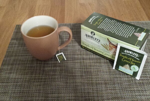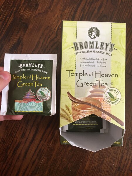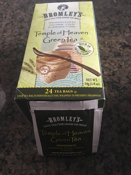 A nice blend of green tea from Bromley. The Exotic Temple of Heaven green tea is great served chilled with lemon. The flavor is great and the tea is so good for you.