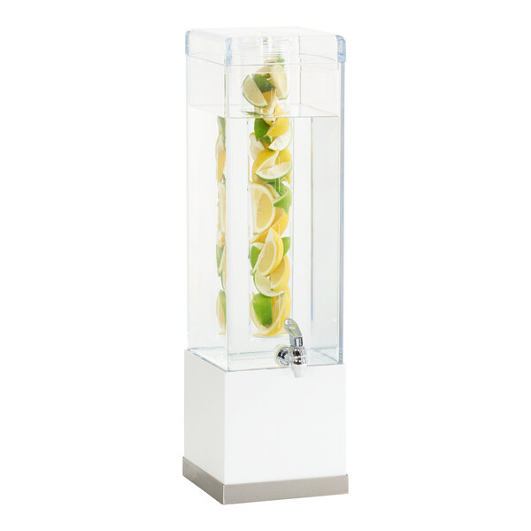 For an eye-catching display, this beverage dispenser features a removable infusion chamber that can be filled with fruits and herbs to achieve strong flavors without the pulp. Its white metal frame is complemented by a shiny, stainless steel base and an easy-to-pour, no-drip dispenser. Its durable polycarbonate construction will create the same luxurious atmosphere of glass but without the risk of breaking. Inside the container is a removable infusion chamber. Simply fill with flavorful fruits or refreshing slices of cucumber and enjoy naturally infused beverages!