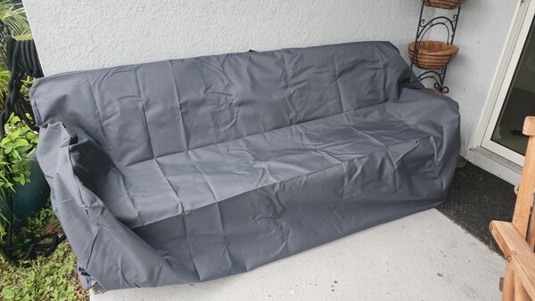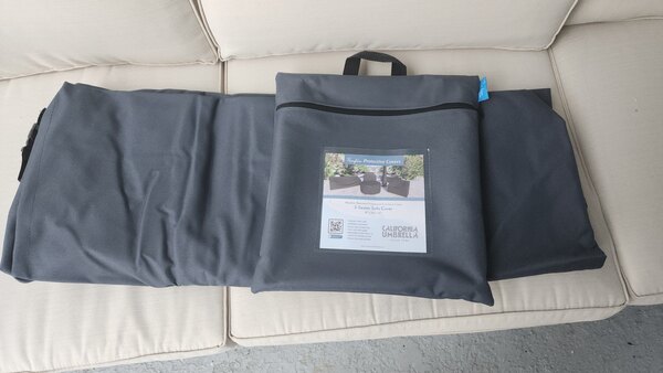 I bought this 3-seat sofa cover by California Umbrella after trying several other quality products they make. The cover is neatly folded into a zippered bag that's about 20% too small, so there's next to zero chance it'll ever be going back into the bag, but since I intend to use this most of the 3/4 summer seasons in Florida, I don't find that too bothersome. The cover is a pretty heavy duty canvas, and given that it'll be exposed to a lot of sunshine, I'll be treating it with California Umbrella Protectant; I do really like that it can be cinched down at the bottom corners, and that it has helpful hand-straps to easily remove this from your sofa.