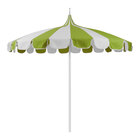 Keep your decks, outdoor dining areas, or poolside patios shaded with this California Umbrella Pagoda 8 1/2' round push lift umbrella with 1 1/2" silver aluminum pole. With a fun, distinct appearance, the Pagoda line will set your intimate outdoor eatery apart from the rest. This umbrella features a silver 2-piece, 1 1/2" thick anodized aluminum pole for a robust foundation. Additionally, the fiberglass ribs provide excellent support for the canopy, and help form the bold curves that create its distinguishing form.