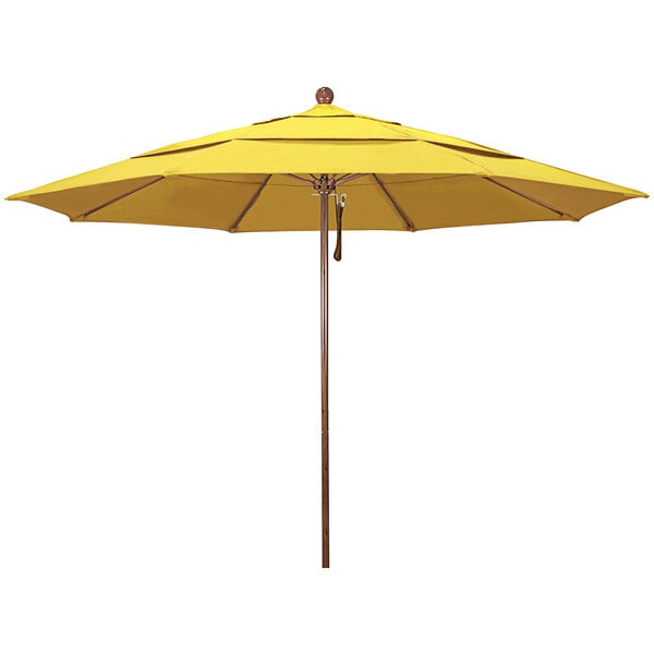 California Umbrella Venture Series 11' Pulley Lift Umbrella with 1 1/2" American Oak Aluminum Pole - Olefin Canopy - Lemon Fabric