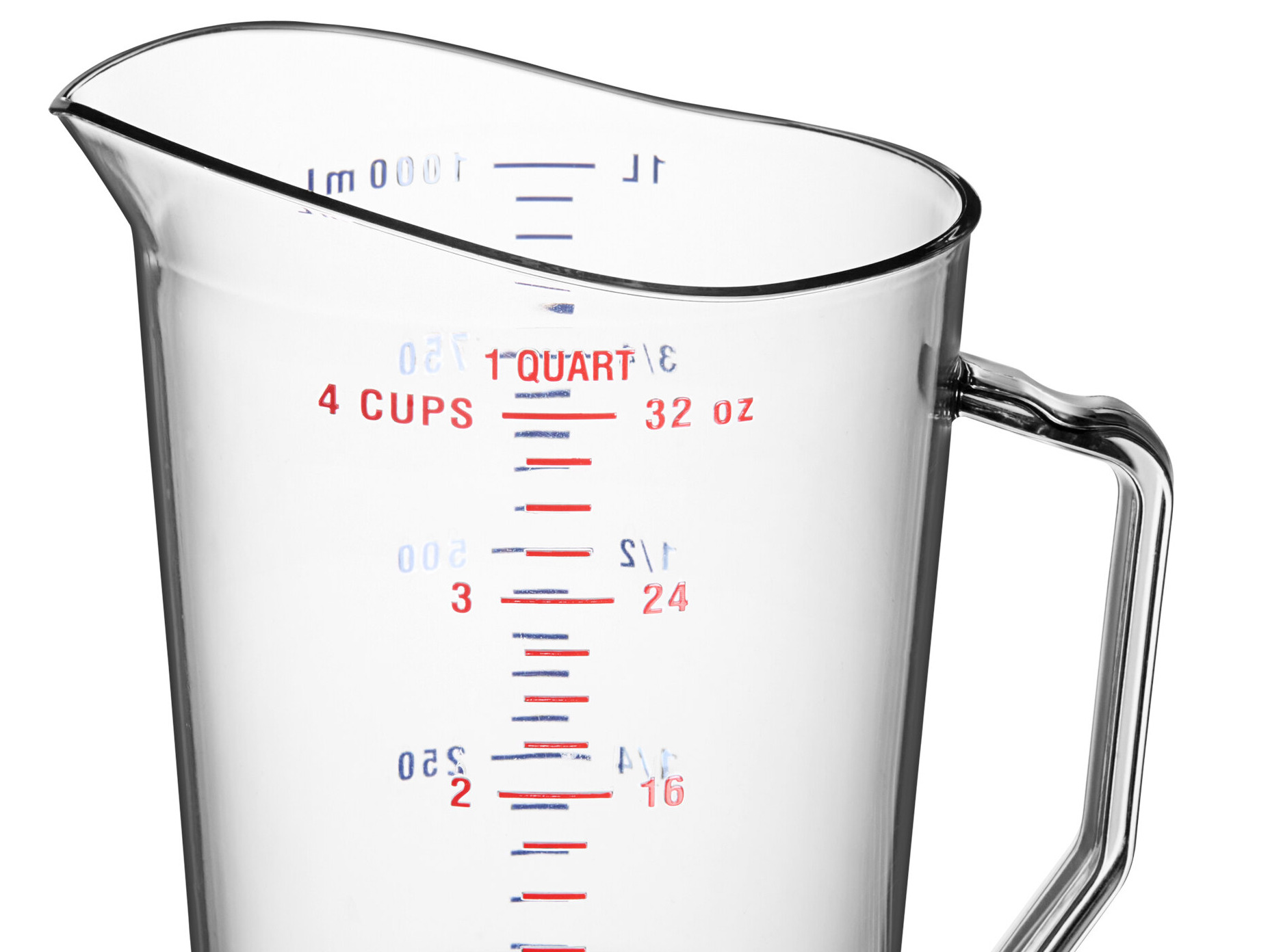 This pitcher is ideal for measuring any beverage as it features easy-to-identify embossed graduations. Its transparent material helps to easily identify the content while measuring. It is a product that we have purchased several times and will continue to do so because of its quality.