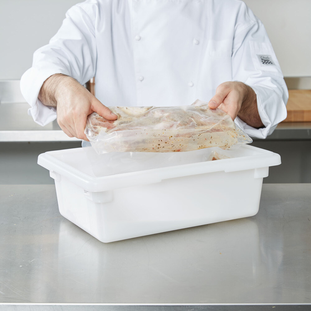 This 12"X18"X6" Cambro box works great for our food storage needs. Cambro brand has always lasted the longest out of any other brands and takes a beating. The only issue I have with these is that when purchased new, they have a label sticker that is extremely difficult to remove. It takes goo gone or a blow dryer to remove. We tried running it through our high temp dishwasher and that didn't help. Additionally, the handles to pick up the storage box are sharp in some areas when new. We gently rubbed them with sand paper to avoid our employees getting cut. Something to double check before putting into use. Besides these two issues we love our Cambro boxes!