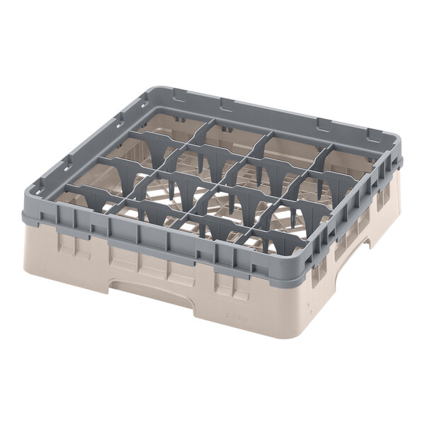 This Cambro 16S318184 beige customizable 16 compartment full size Camrack comes with everything you need for washing, storing, and transporting large cocktail glasses, delicate wine stems with oversize bowls, and other items with a diameter of up to 4 3/8", standing up to 3 5/8" in height. Included is (1) 16E1 extender and (1) beige-colored BR258 base rack.