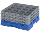 This blue Cambro 16S738168 customizable 16 compartment full size Camrack has everything you need for washing, storing, and transporting large cocktail glasses, delicate wine stems with oversize bowls, and other items with a diameter of up to 4 3/8", standing up to 7 3/4" in height. Included is (1) gray 16E1 extender, (1) gray 16E2 extender, (1) gray 16E5 extender and (1) blue-colored BR258 base rack.