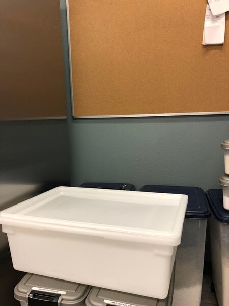 This white plastic bin seems much more durable than the clear version available. We use for thawing frozen items, freezer storage and sous vide cooking