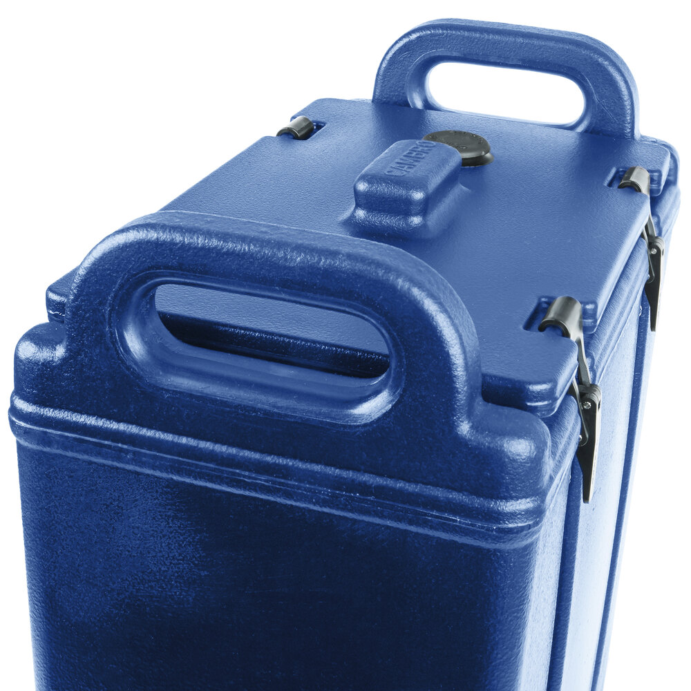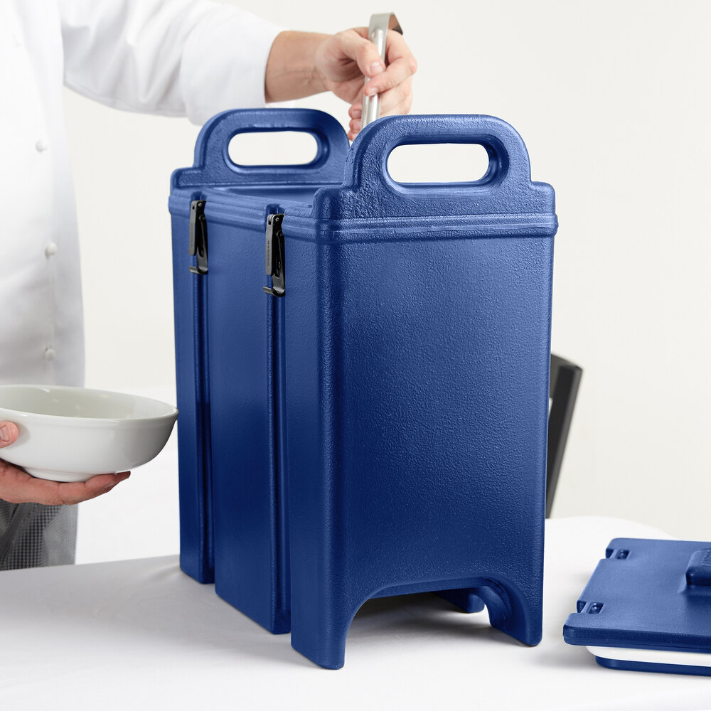 Ensure your signature broths, stews, and soups remain hot during the entirety of lunch or dinner service. From catered events to banquet halls, this carrier provides outstanding temperature retention for up to 4 hours at a time. Its easy-to-transport design creates a smooth transition from the kitchen to your next event. The attractive, navy blue color even provides a professional appearance in any situation. Plus, a set of self-adhesive beverage labels are also included for quick identification of your most popular soup items. This durable dispenser enhances any food service with remarkable ease!