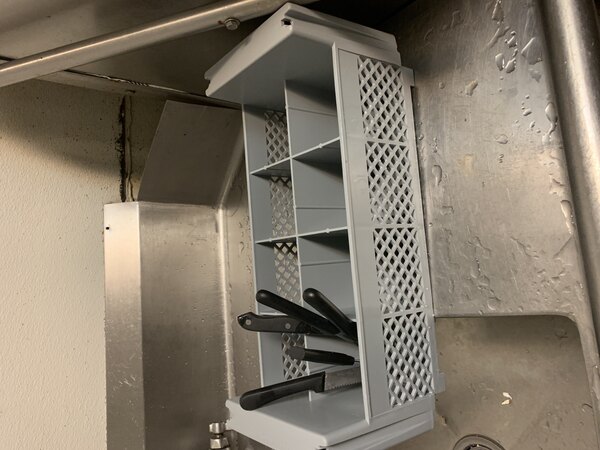 Purchased for use in a QSR with no dishwasher. This rack serves as a great way to store flatwares that meets NSF standards and allows them to air dry. One of my pet peeves is when staff stores items in a pan or tub and grit and grime accumulates at the bottom. Get a couple of these and that issue is eliminated.