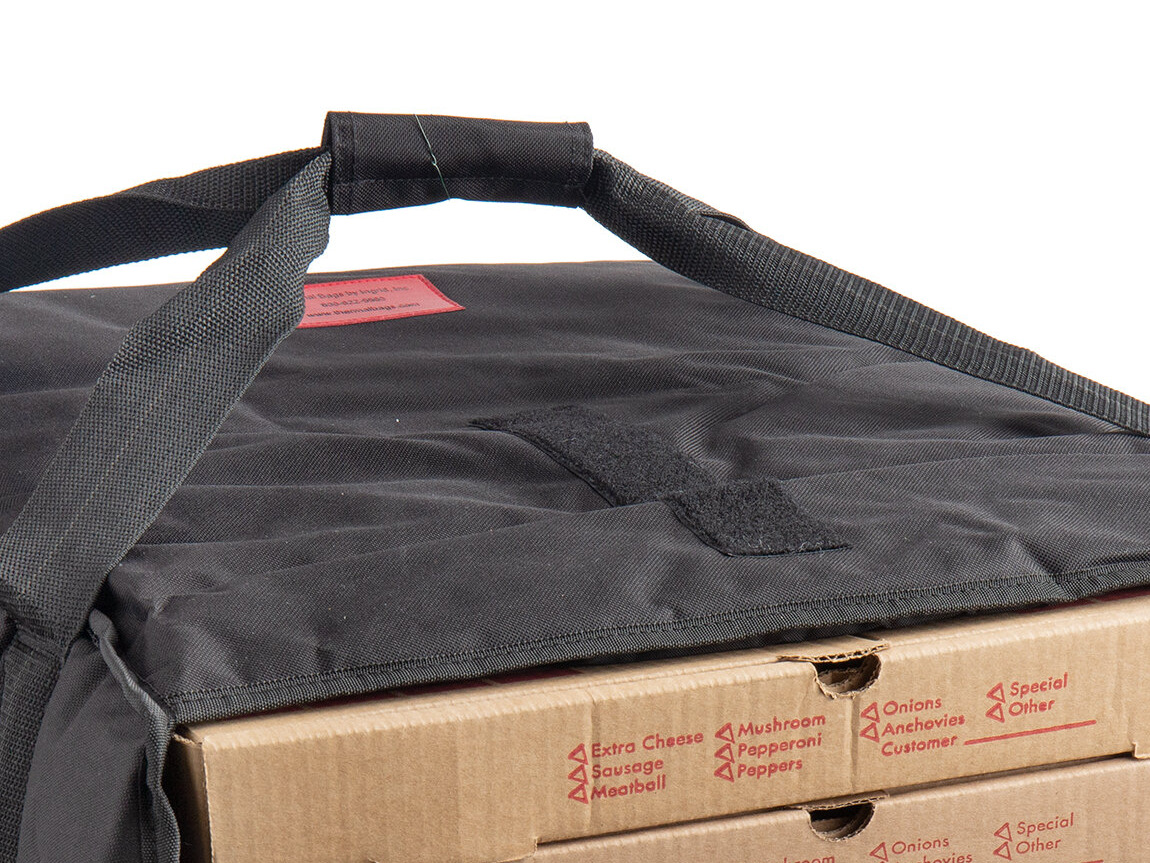 The nylon carrying handle and heavy-duty, sewn-in straps will support the weight of a full bag, allowing a comfortable grip without digging into the carrier's hands and preventing tearing and ruined, dropped pizzas.