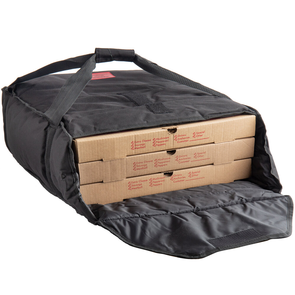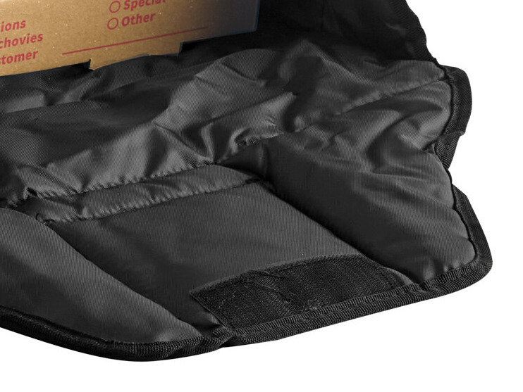 This insulated black pizza delivery go bag is a breeze for our employees to use. Its handles help keep product centered in the bag so there is no slipping.