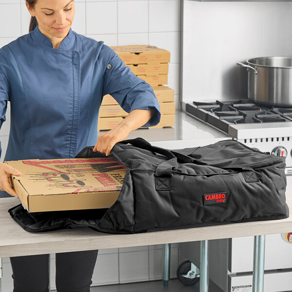 Perfect for large volume orders, this pizza delivery bag can hold up to (3) 18" or (4) 16" pizza boxes. Your customers will appreciate piping hot pizza that tastes like it was just pulled out of the oven delivered right to their door. Plus, a convenient ticket pouch holds your tickets and receipts securely in place so they do not become misplaced in transit. From a brand you trust, this Cambro GoBag® will help you maintain the quality of your carefully prepared foods to ensure exceptional customer satisfaction.