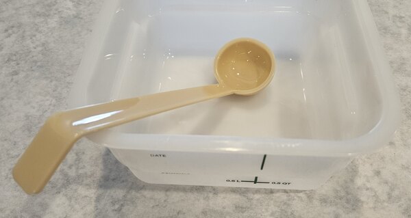 Perfect ladle for our salad bar , large handle allows to dip amd reach bottom of bowl . Perfect size to get the right amount of dressing