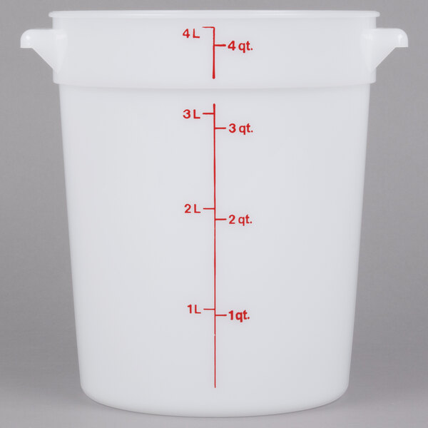 Exceedingly versatile in both size and design, this container is perfect for portioning and storing all your ingredients, toppings, and pre-prepared foods. Simply pair with a compatible lid (sold separately) to keep your foods fresh. Its solid white color makes the container easy to spot in a crowded refrigerator or dry storage room, while a 4 qt. capacity provides users with the perfect storage amount for extra servings of your favorite recipes!