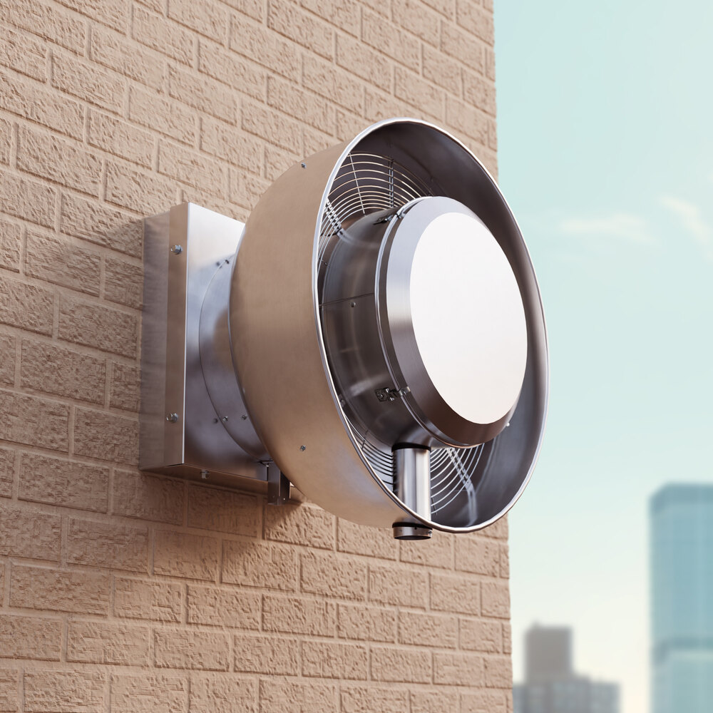 This rugged exhaust fan mounts directly to the wall, or it can be installed on your rooftop. For rooftop applications, a 17" opening is required.