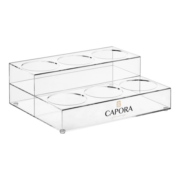This Capora 2 tier syrup bottle organizer is a necessary addition to any bar, lounge, coffee shop, or cafe! This trendy storage solution features six 3 1/2" wide compartments to neatly organize and display a variety of flavoring syrups or alcohol bottles.