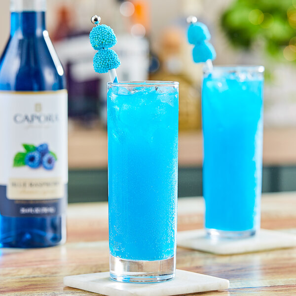 Packaged in a unique bottle with a stylish design, this Capora blue raspberry flavoring syrup has an attractive shelf presence that makes it a great addition to your restaurant, bar, coffee shop, or cafe. It can be paired with a compatible pump (sold separately) for quick, efficient service during peak serving hours. You can even store the bottle in one of the companion Capora racks (sold separately) to create an eye-catching display.