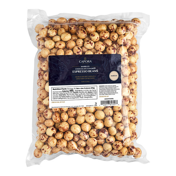 These bold, crunchy espresso beans are coated in a thick layer of marbled white and semi-sweet chocolate compound for a decadent treat that will satisfy any sweet tooth. In addition to their irresistible flavor, these caffeinated chocolatey covered espresso beans provide an extra bit of energy to keep your patrons going throughout the day. This product is a great addition to the menus of coffee shops and cafes, bakeries, ice cream parlors, and catering businesses! These beans are packaged in a bulk 5 lb. bag that will keep your busy establishment in good supply of this delicious product.