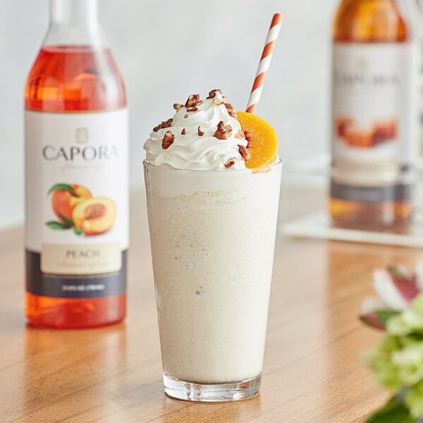 Packaged in a unique bottle with a stylish design, this Capora peach flavoring syrup has an attractive shelf presence that makes it a great addition to your restaurant, bar, coffee shop, or cafe. It can be paired with a compatible pump (sold separately) for quick, efficient service during peak serving hours. You can even store the bottle in one of the companion Capora racks (sold separately) to create an eye-catching display. This ready-to-use syrup mixes thoroughly and evenly with both hot and cold beverages.