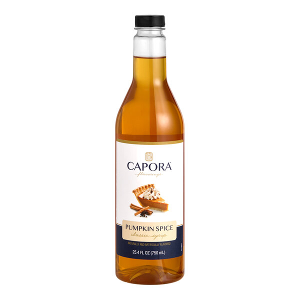 Packaged in a unique bottle with a stylish design, this Capora pumpkin spice flavoring syrup has an attractive shelf presence that makes it a great addition to your restaurant, bar, coffee shop, or cafe. It can be paired with a compatible pump (sold separately) for quick, efficient service during peak serving hours. You can even store the bottle in one of the companion Capora racks (sold separately) to create an eye-catching display.