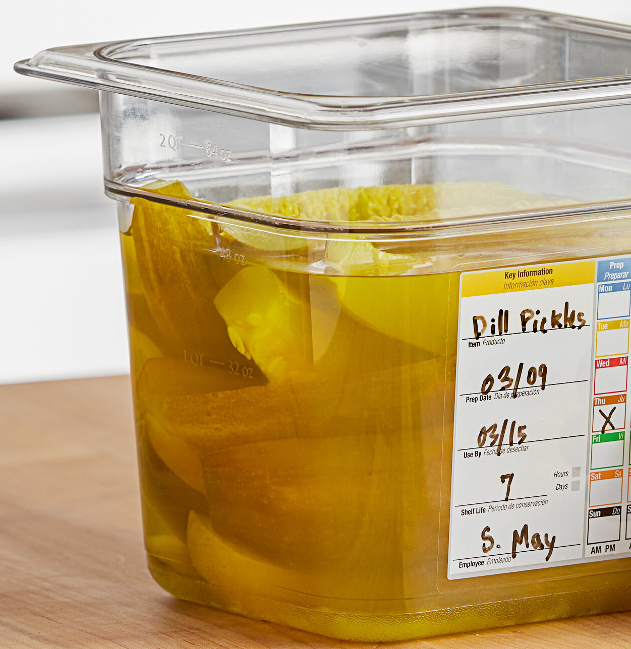 - English and Spanish labels support bilingual kitchen staff